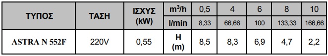 Η υποβρύχια αντλία λυμάτων και ακαθάρτων Astra N 552F της Anavalos, διαθέτει πτερωτές με τα οποία απομακρύνονται από τo στόμιο εξόδου με πολυσύνδεση G1”, ή G1-1/4”, ή G1-1/2”, με δυνατότητα εξαγωγής σωματιδίων μέχρι και 5mm. Μια ποιοτική, φορητή και ελαφριά βυθιζόμενη αντλία σχεδιασμένη για οικιακή χρήση άντλησης αποβλήτων, αναβλυζόντων υδάτων, πλημμύρες υπόγειων χώρων, άδειασμα φρεατίων και δεξαμενών, καθώς και για ήπια βιομηχανική χρήση.