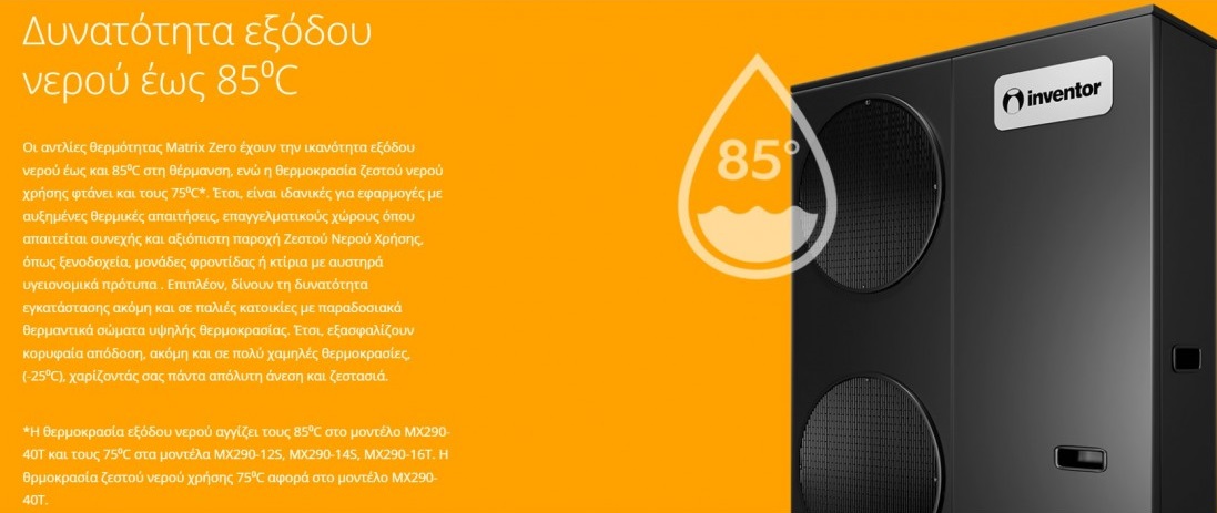 Οι νέες αντλίες θερμότητας Inventor Matrix Zero με ψυκτικό μέσο R290 και GWP που πλησιάζει το 0, είναι η βιώσιμη επιλογή για θέρμανση και ψύξη! Εξασφαλίζουν εύκολη εγκατάσταση, υψηλή ενεργειακή απόδοση και αξιόπιστη λειτουργία, είναι κατάλληλες για νέες κατασκευές ή ανακαινίσεις, σπίτια ή επαγγελματικά κτίρια, επιτρέποντας την αξιοποίηση υφιστάμενων υποδομών. Χάρη στην ενεργειακή κλάση A+++, προσφέρουν μέγιστη εξοικονόμηση ενέργειας, ενώ παράλληλα είναι σχεδιασμένες με γνώμονα την ασφάλεια. Το ενσωματωμένο σύστημα πολλαπλής προστασίας περιλαμβάνει θωρακισμένη ηλεκτρολογική διάταξη αντιεκρηκτικής σχεδίασης, βαλβίδες υπερπίεσης και διαχωριστικά ασφαλείας για πλήρη απομόνωση του ψυκτικού μέσου, πληρώντας τις αυστηρότερες προδιαγραφές ασφάλειας, ενώ χρησιμοποιείται ελάχιστη ποσότητα ψυκτικού υγρού. Η δυνατότητα εξόδου νερού έως 85°C (και έως 75 °C για τα μοντέλα μοντέλα MX290-12S, MX290-14S, MX290-16T) εγγυάται απρόσκοπτη και αποδοτική λειτουργία, ενώ το ζεστό νερό χρήσης μπορεί να φτάσει τους 75°C. Επιπλέον, διαθέτουν χαρακτηριστικά που εξασφαλίζουν κορυφαία απόδοση ακόμη και σε ακραία χαμηλές θερμοκρασίες, έως και -25 °C στη θέρμανση, και 46°C στην ψύξη. Ο προηγμένος συμπιεστής DC EVI Scroll προσφέρει πιο αποδοτική λειτουργία κατά 20%, χαμηλά επίπεδα θορύβου και χαμηλή κατανάλωση ενέργειας. Η ζώνη θέρμανσης εξασφαλίζει μέγιστη προστασία από δυσχαιρείς καιρικές συνθήκες και υψηλή απόδοση στη θέρμανση. Ταυτόχρονα, το χειριστήριο με ελληνικό μενού και το Wi-Fi προσφέρουν περισσότερη άνεση.