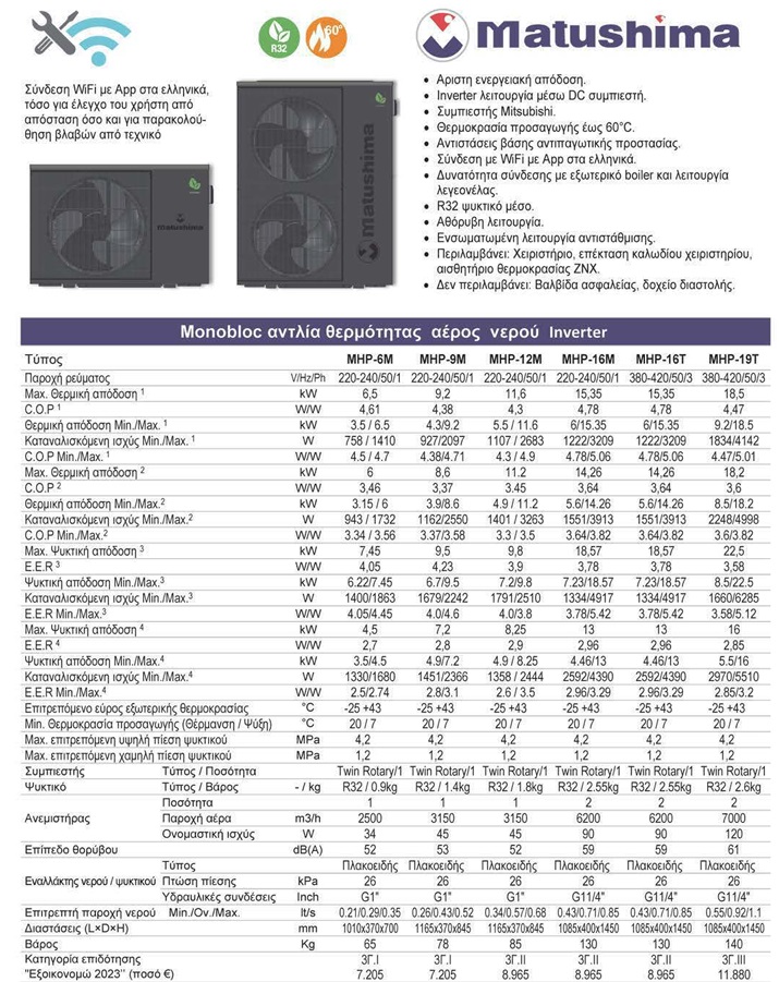 Η αντλία θερμότητας Matushima ενσωματώνει την τελευταία λέξη της τεχνολογίας ώστε να διατηρεί τους χώρους στην ιδανική θερμοκρασία με τη μεγαλύτερη δυνατή εξοικονόμηση ενέργειας. Η μονάδα είναι εξαιρετικά αποδοτική με ψηλό συντελεστή απόδοσης (COP) παρέχοντας ιδιαίτερα χαμηλό κόστος λειτουργίας και μέγιστη ενεργειακή απόδοση.