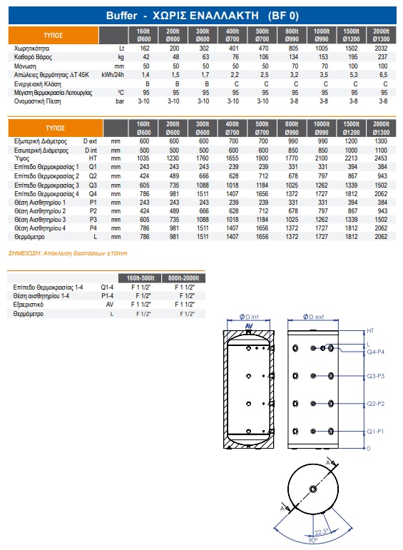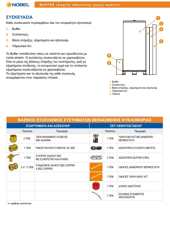 Σχεδιασμένα για πλήθος εφαρμογών, τα buffer της εταιρείας Nobel μπορούν να χρησιμοποιηθούν σε εγκαταστάσεις με αντλίες θερμότητας, λέβητες, τζάκια, ενδοδαπέδια θέρμανση, καλοριφέρ, ηλιοθερμικά συστήματα (συλλέκτες) και στη δημιουργία πρωτεύοντος-δευτερεύοντος κυκλώματος. Η χρήση τους συμβάλλει στην αποθήκευση ζεστού νερού όταν το σύστημα θέρμανσης είναι σε λειτουργία και στη διατήρησή του διαθέσιμου όγκου νερού όταν χρειάζεται. Διατίθενται σε χωρητικότητες από τα 25-2000 λίτρα, επισμαλτωμένα ή χωρίς σμάλτο (μαύρης βαφής).